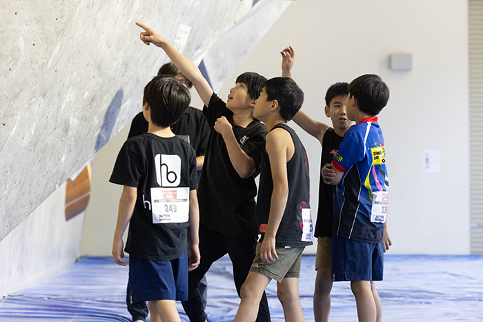 最後に行われた5・6年男子は6年生が5人を占め、大人顔負けのダイナミックなムーブが連発した。3課題目を終えて4人が3完登で並ぶ展開も会場を熱くさせた。最終課題はゴールタッチの惜しいトライが続くも、4人のうち3人は4完登目を決め切れず。声を上げながら最後の一手を決め、大きな拍手を送られた齋木郁希だけがこの課題の完登者になるかと思われたが、最後に登るここまで全完登の上田大志が6トライ目にゾーンをとらえると、そのまま残り約20秒を残す状態で登り切った。優勝には完登しかない状況で、実質最後のトライで攻略する劇的な幕切れだった。