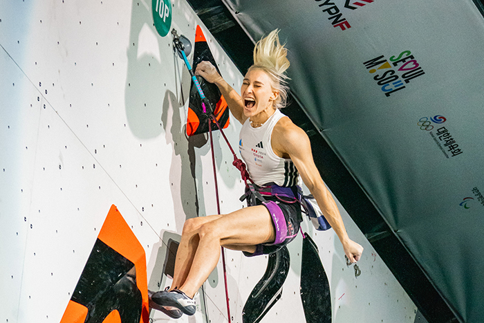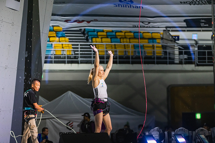 女子はガンブレットが3大会ぶり3度目のリード優勝に輝いた。昨夏のパリ五輪で五輪2大会連続優勝の快挙を遂げた絶対女王は、予選、準決勝を1位通過すると、決勝でも抜群の安定感で完登に近づいていく。2分を残して高度40に到達すると、最後のムーブの前に長いレストを取り、ランジを決めて完登を果たした。