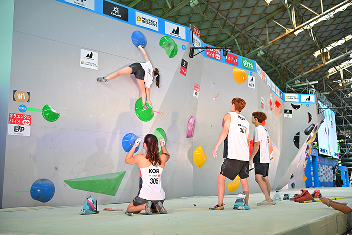 男子2人が完登し、競技を続けている女子のサポートに回った韓国チーム