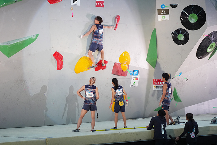 すると4カ国目に登場した予選1位通過の日本が格の違いを見せる。天笠、中村、安楽が最初のアテンプトでトップホールドに達すると、野中は親指で押し上げるようにゴール下のホールドを保持。そのまま完登し、4人全員が一撃で25ポイントを得た日本が満点の100点スタートを決めた。