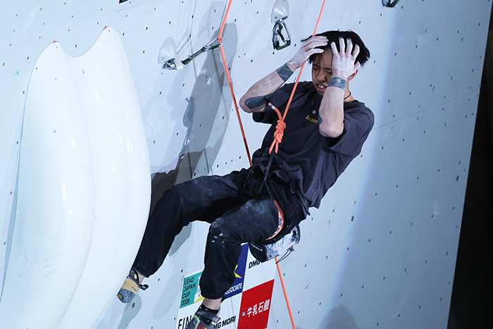 「ホールドを見落として落ちてしまった。オブザベでは何となく認識していたが、壁に入り込んだら頭から抜けてしまった。登り的にはもう少し行けた感覚があるが、順位で見ると結構頑張ったなという感じはある。この春に就職する。(アスリート社員等ではなく)一般就職なので、今大会を最後に引退を考えていた。この順位だとWCシリーズに出られるが、入社したらおそらく休めない。今後どうするかは少し考えたい。(クライミングを)やりたい気持ちも少し出てきている」
